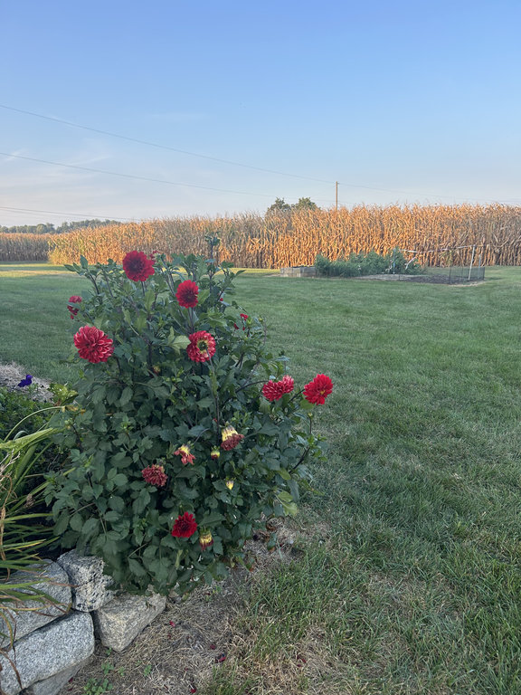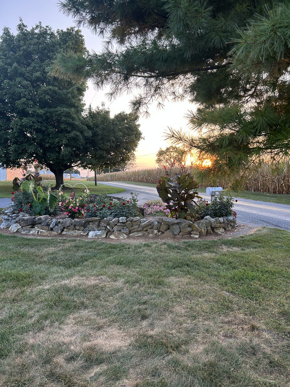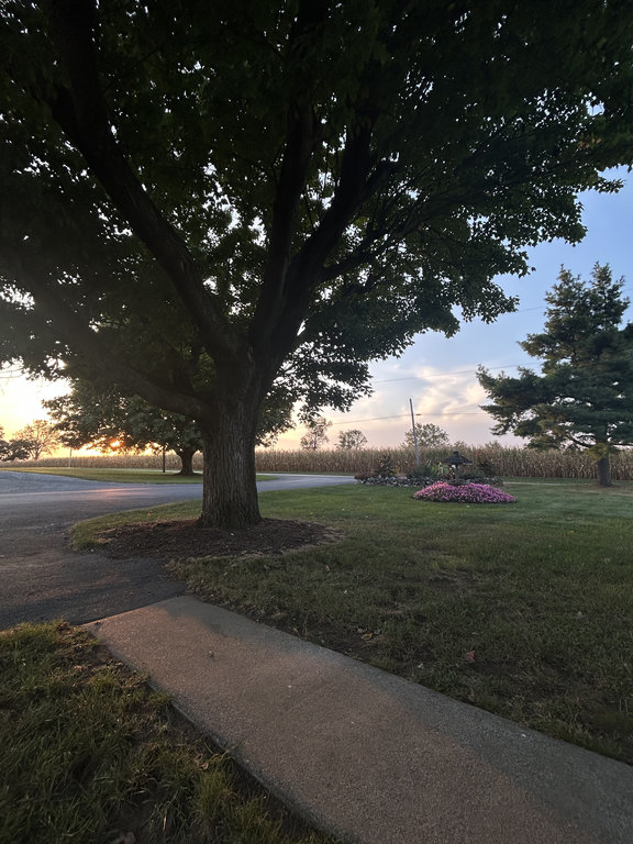 This picture was at my house and in the foreground was the flower bed, and the middle ground was the trees, and in the background was the corn and the sunset.