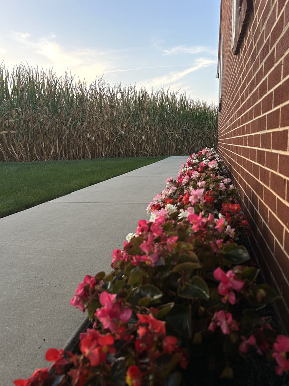 In this picture the flowers are in the foreground and in the middle ground is the side walk, amd that leaves the corn feild being in the background.