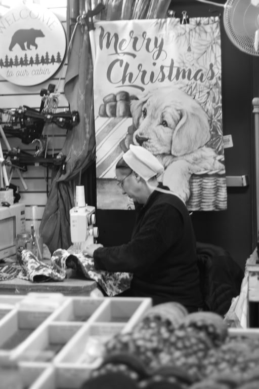 These three pictures show different compositions. The one on the left shows the rule of thirds with the tree on a thirds line. The middle picture has framing with each of the different white frames showing something different in the picture. I think the middle frame has the best subject. The right picture has layering and depth with the cloth and wooden container in the foreground, the woman sewing in the midground and the Christmas cloth in the background.