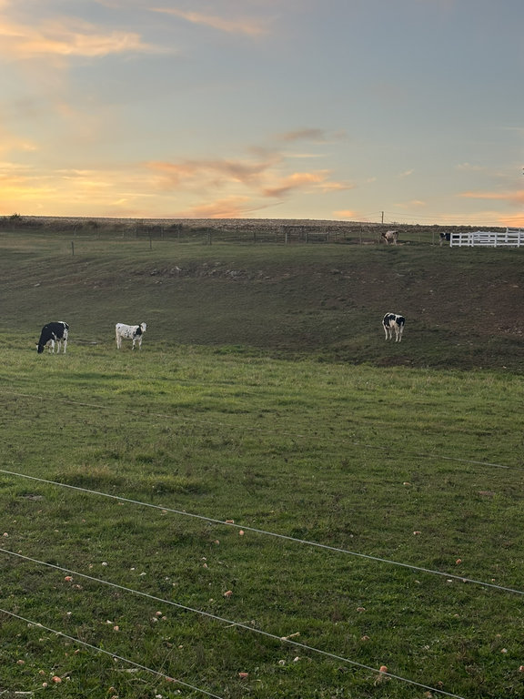 This shows the wire n land in the front, cows n hill in the middle, and the sky in the back
