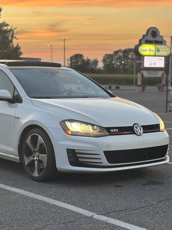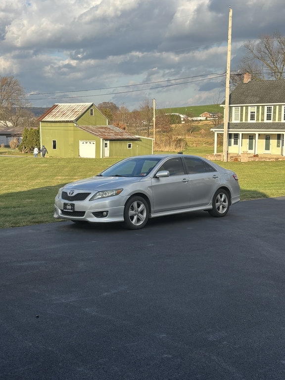 The car is in the foreground, sign in the mid, and trees/sky in the back