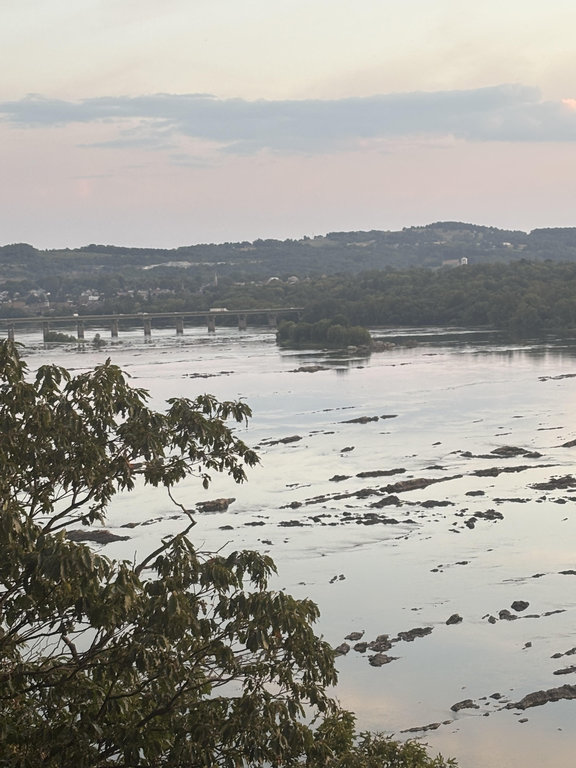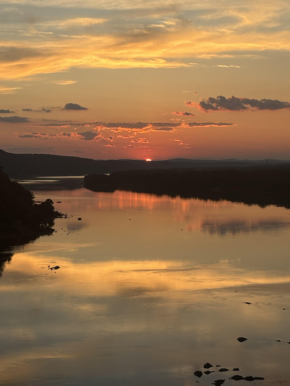 This shows the river in the foreground, trees in the midground, and sun in the back